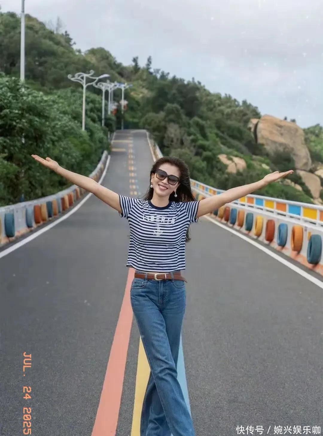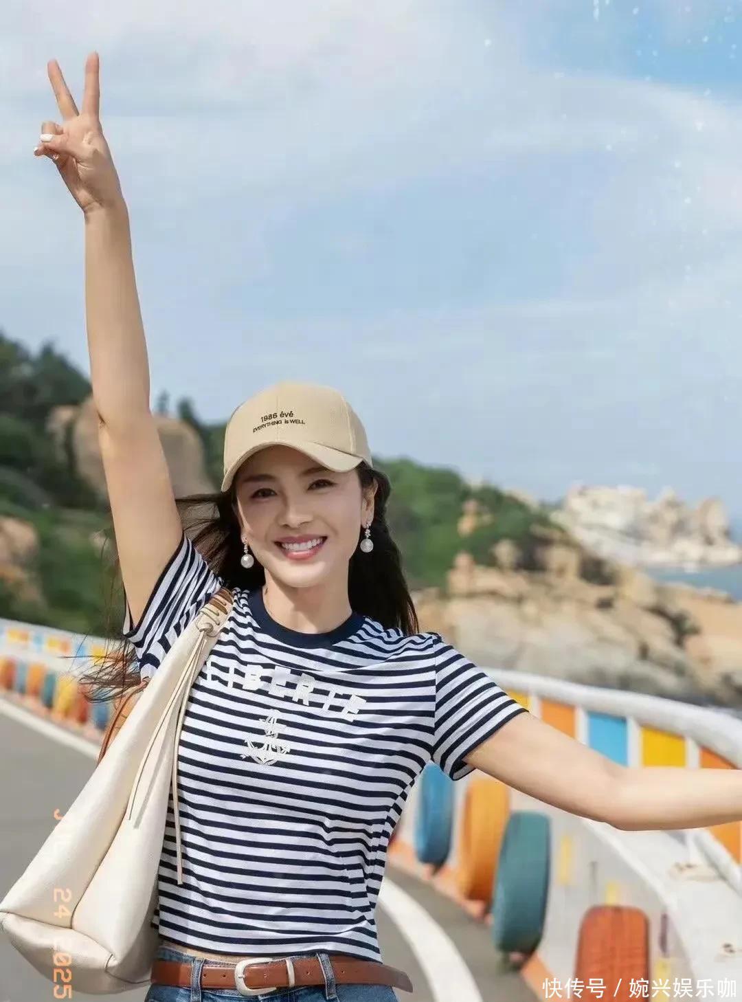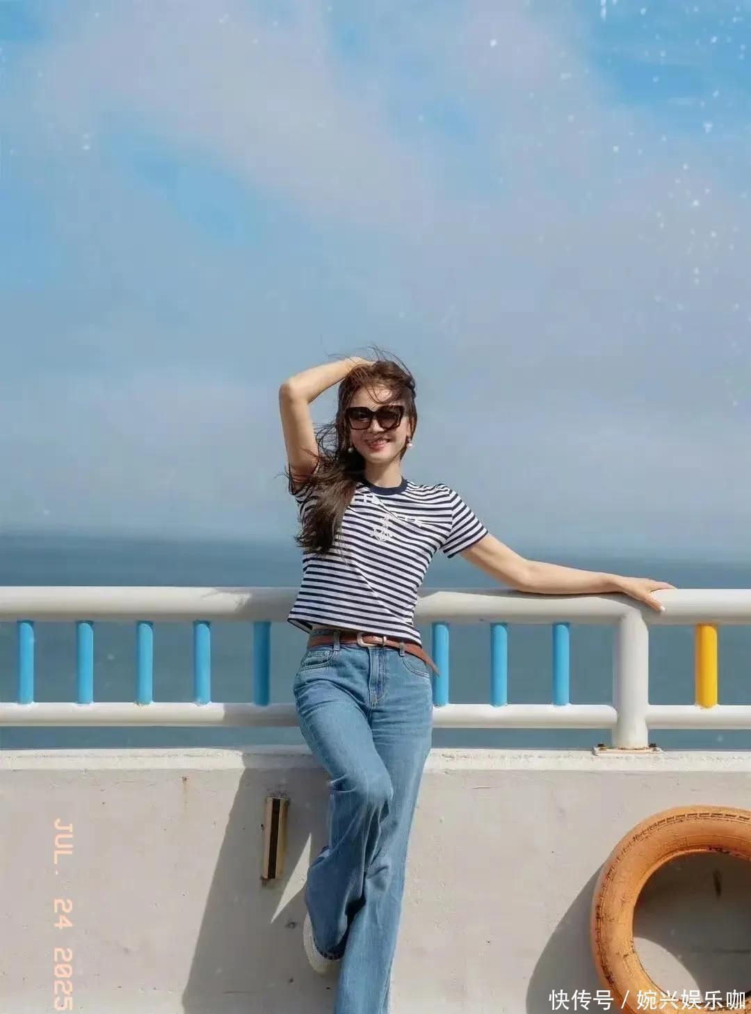 刘涛上身搭配一件条纹修身T恤,下身选拔经典蓝色紧身牛仔裤,勾画出修长径直的腿部线条。脚踩一对白色失业鞋,举座造型澄澈利落,既显活力又不失优雅。她将长发当然披垂,妆容高雅,一抹红唇更添明媚,九牛二虎之力间尽显造就女性的自信魔力。