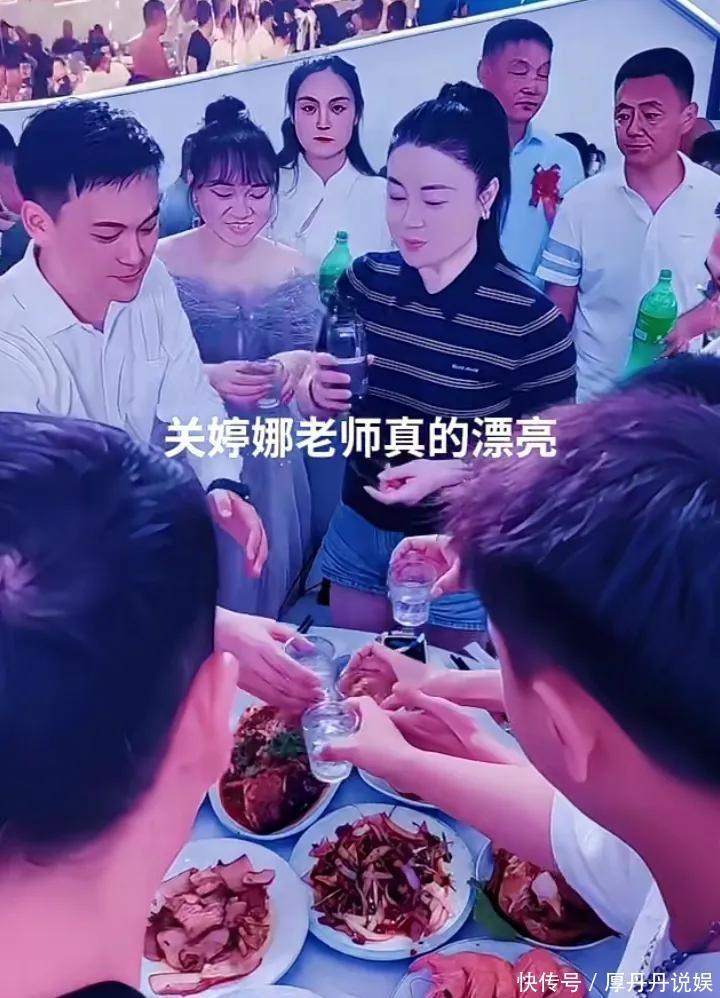 婚宴上菜王人是大鱼大肉,猪蹄、虾这些硬菜王人有。关婷娜跟各人一块喝酒,有东说念主夸她年青看着像四十不到。她也不搭架子,主动跟粉丝合影,近看皮肤如实可以。